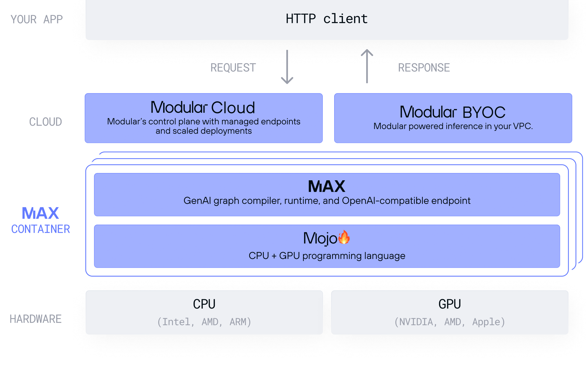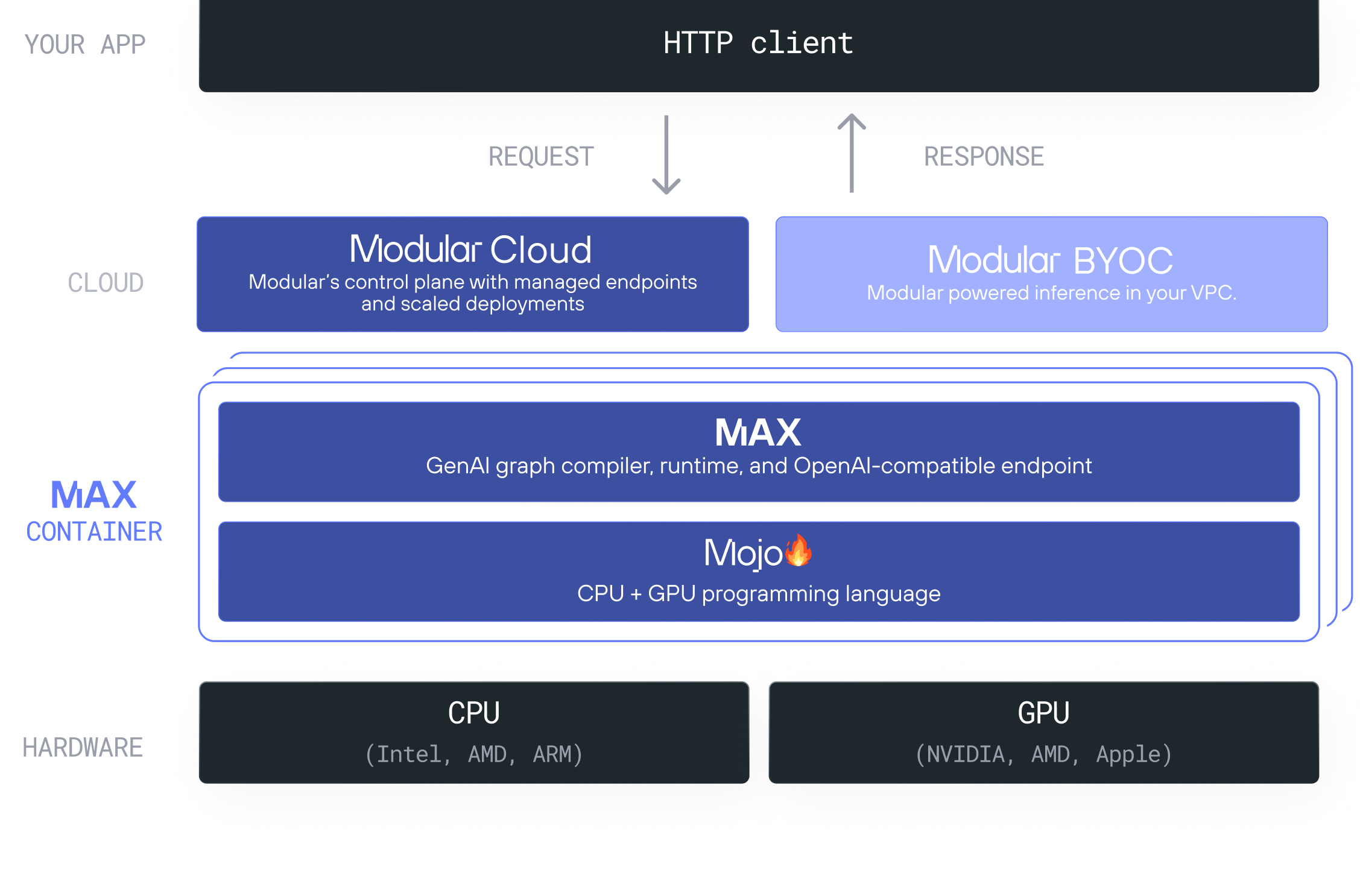 Modular is a vertically integrated AI infrastructure stack that spans that provides entry points for users at every level.