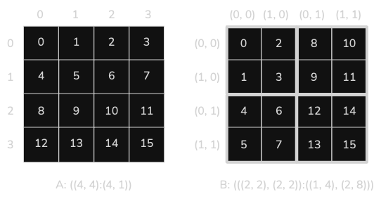 Layouts A and B are both 2D matrix layouts with the same overall 2D shape, but with the elements in a different order. Layout B is tiled, so instead of being in row-major or column-major order, four consecutive indices are grouped into each 2x2 tile. This is sometimes called tile-major order.