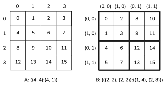 Layouts A and B are both 2D matrix layouts with the same overall 2D shape, but with the elements in a different order. Layout B is tiled, so instead of being in row-major or column-major order, four consecutive indices are grouped into each 2x2 tile. This is sometimes called tile-major order.