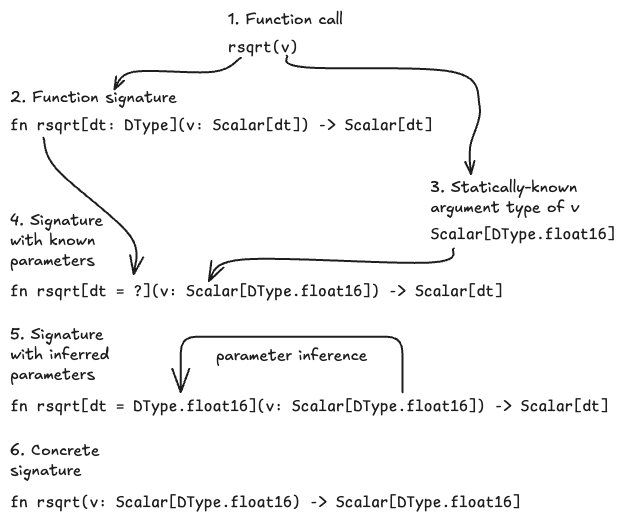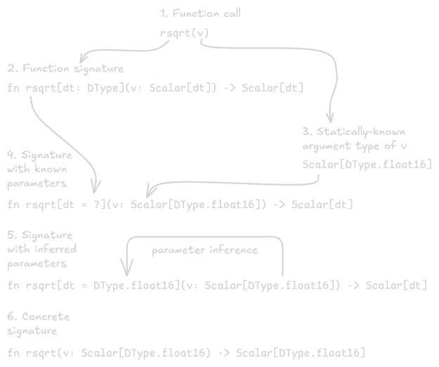 One of the consequences of Mojo not performing function instantiation in the parser like C++ is that Mojo cannot always figure out whether some parametric types are equal and complain about an invalid conversion. This typically occurs in static dispatch patterns. For example, the following code won't compile: